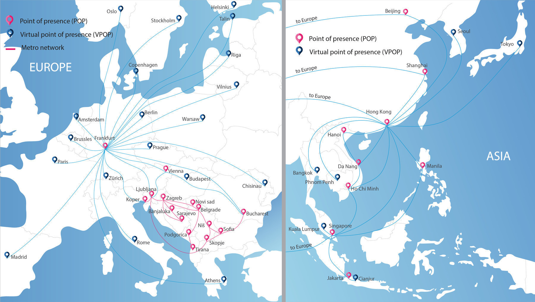V državah, kjer poteka SoftNET-ovo omrežje, je prav tako izvedeno nacionalno omrežje za doseganje tudi manjših krajev. Poleg tega smo med vsemi glavnimi vozlišči zagotovili več zmogljivih povezav. Za zagotovitev čimboljše pretočnosti je izvedenih preko 200 medomrežnih povezav na internet stičiščih VIX, DE-CIX, SIX in CIX. Z načinom izvedbe omrežja vam tako zagotavljamo odlično pokritost regije.